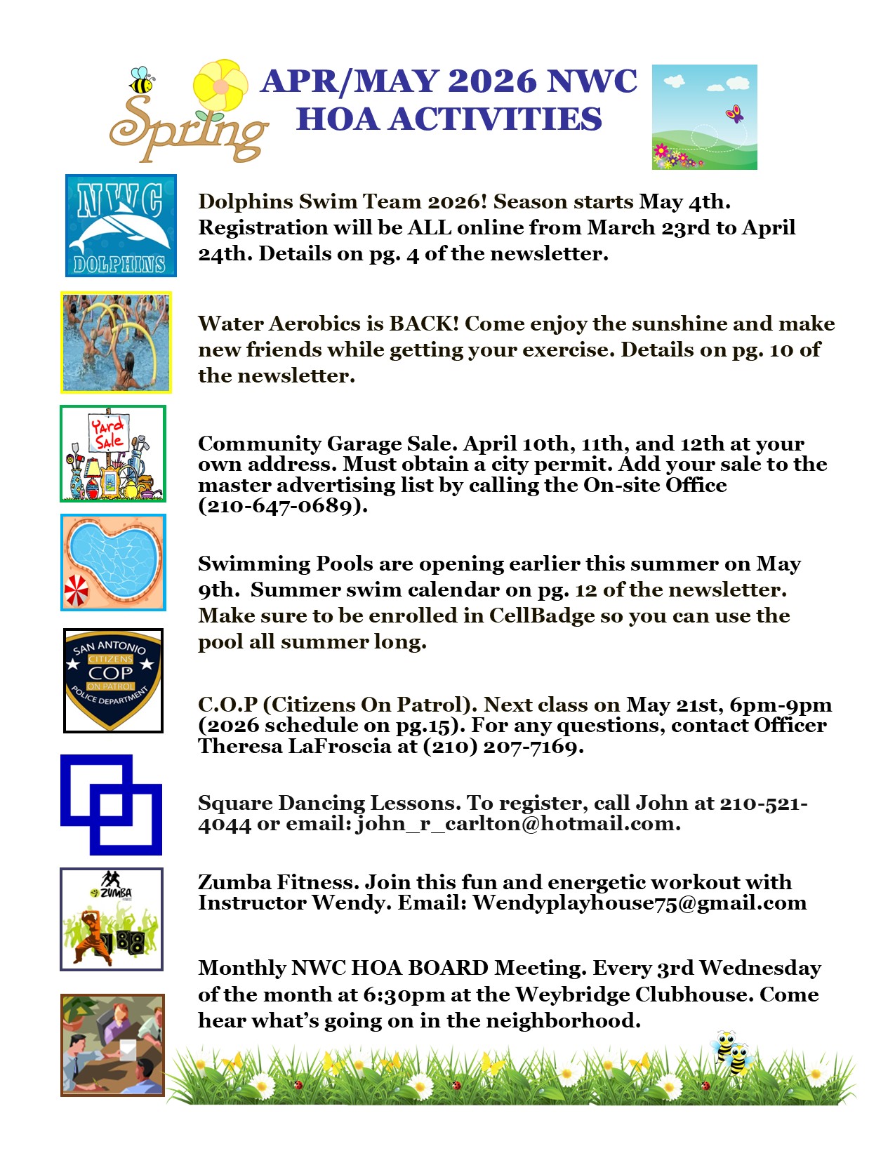 We host a variety of fitness activities such as water aerobics, Zumba, and square dancing lessons. The NWC Dolphins swim team is one of the most veteran competitive youth swim teams in the city. We also offer swim lessons from May to September.